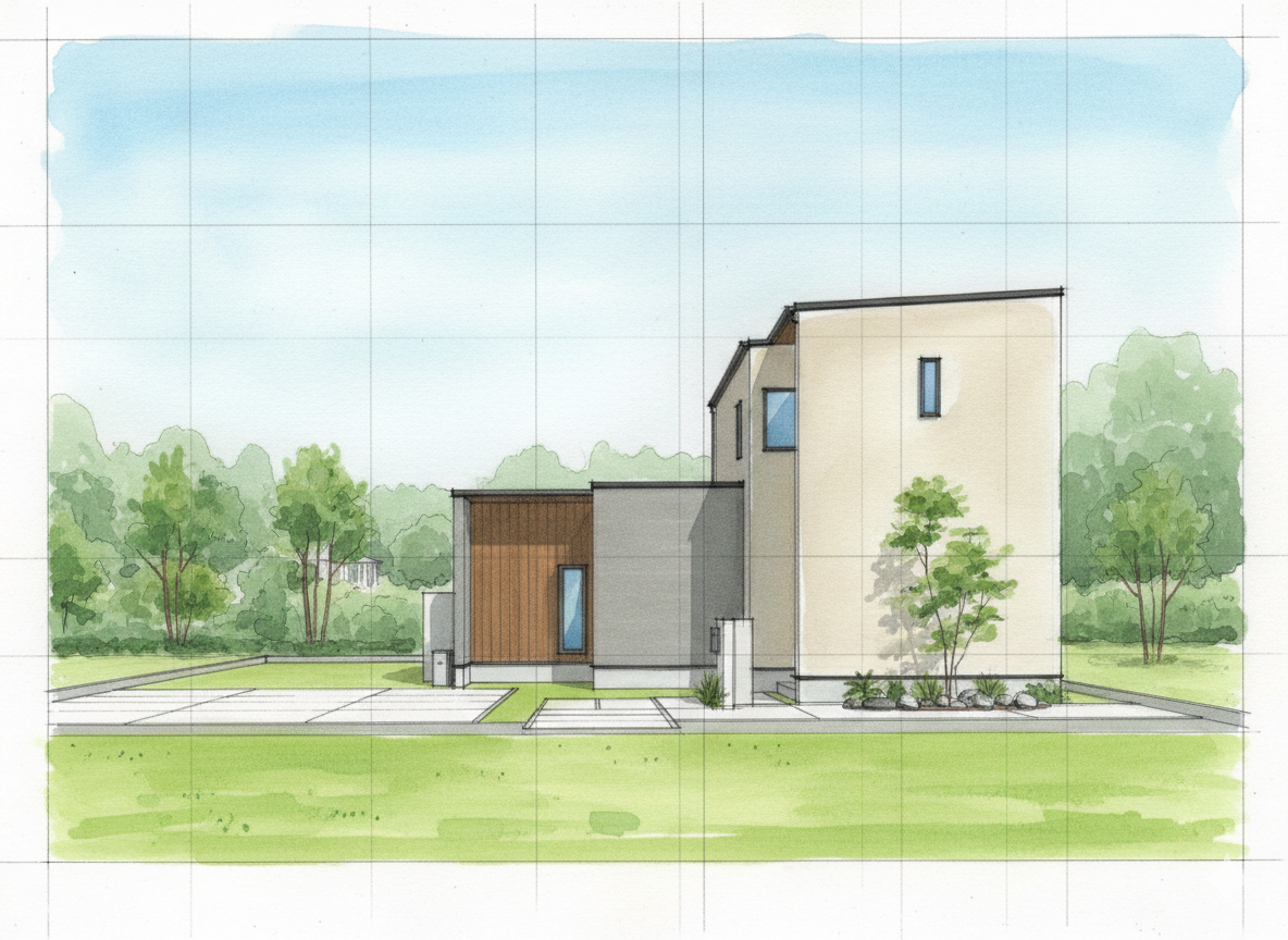 開けた土地に建てられたこちらのお住まいは、東・西・南・北から見える方向によって表情をガラッと変えるデザインとなっています。