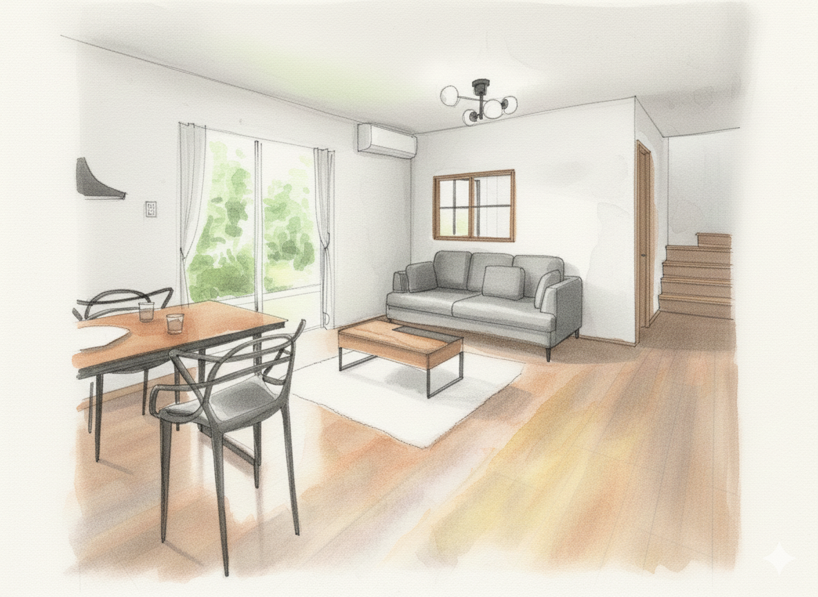 優しいベージュをペースに、軒や外壁の一部に木目をアクセントとして採用。内観は大人のトラッドスタイルで落ち着いた雰囲気です。
