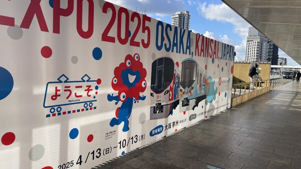 新大阪駅には、もう終わってしまった大阪万博の看板がありました。