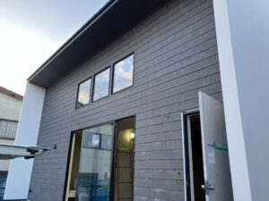 シンプルながらも存在感のある佇まいで、青空に映える外観に、現場スタッフからも「完成が楽しみですね」と声が上がっています。これから外構工事も進み、さらに雰囲気が整っていく予定です。