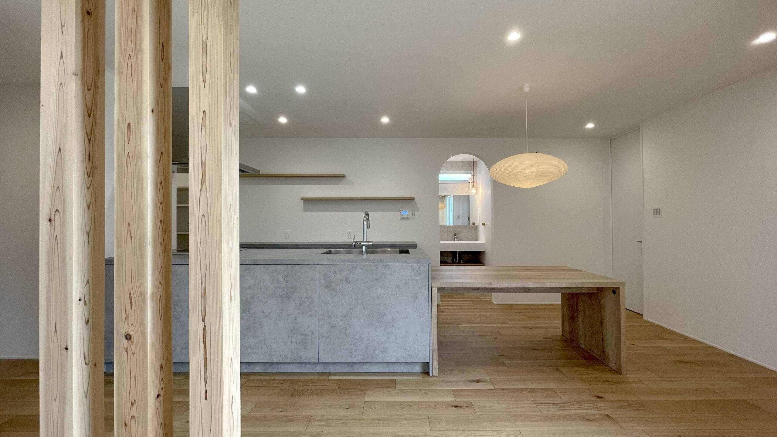 34坪・3LDKのゆとりある住まい。外観は白のガルバリウムと温もりある木目が調和し、上質で洗練された印象を演出します。LDKにはグラフテクトキッチンとダイニングテーブルを一体で配置し、家族の時間をより豊かに。大型土間収納やパントリー・ランドリー・ファミリークローゼットを備え、収納も十分に確保。生活動線を考え抜いた回遊導線で暮らしやすさと美しさを兼ね備えた、永く愛せる住まいです。